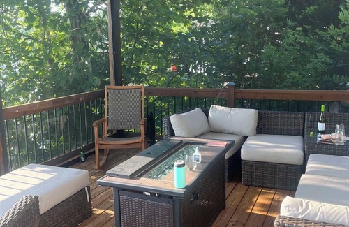 The spacious deck, equipped with retractable screens to keep you safe from mosquitos, overlooks the 660 acre, all-sports lake, providing the perfect spot for sipping your morning coffee, taking an afternoon snooze on the hammock, or enjoying a glass of wine near the fire table while taking in our breathtaking Pine Lake sunset views. The private dock offers direct access to the water, where you can swim, fish, play with our many lake toys – including a lily pad, 2 paddle boards, a paddle boat, inflatables and more - or embark on a leisurely boat ride (Pontoon available for rent for additional fee - contact host to discuss) to grab lunch at the Marina. Lifejackets for all shapes and sizes and beach towels are included. Finish your day making s’mores at our lakefront fire pit.