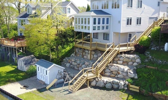 Step inside to discover a beautifully furnished living space, where large windows frame breathtaking views of the water. The open-concept layout creates a seamless flow between the living room, dining area, and fully equipped kitchen, making it ideal for unwinding with friends and family. Enjoy your dinner, fresh from the gas grill, surrounded by views of the lake, in our all-window all-seasons room.