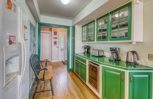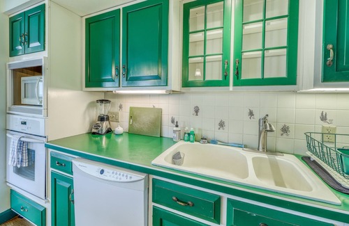 Enjoy easy meal prep in the luminous, fully stocked kitchen, quaintly trimmed with green and white and featuring a center island with stools for dining space. A large lake-view dining table perches nearby, and a comfortable living awaits in the next room.
