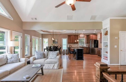 When planning your wedding stay at the beautiful Lakefront Home with Hot Tub, Home Theater, Fire Pit and Lake Access, you'll discover a serene environment surrounded by nature. This exquisite accommodation is designed to cater to the needs of wedding groups, providing ample space and exceptional amenities.