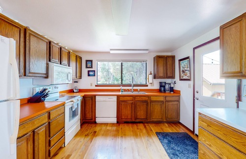 After a day full of adventure, head back inside your stay where relaxation is inevitable. The water view living room is adorned with ample, soft seating, a large TV, and tasteful mementos of lake life. The home's full kitchen presents a pleasant place to play chef amongst the wooden cabinetry and full suite of appliances. When you aren't sitting down for a meal at the adjacent dining table, play one of the provided board games with your loved ones.