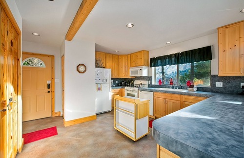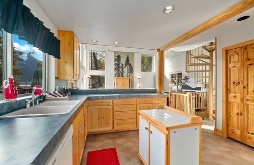 Here on the lakeshore, you'll have a private dock and two decks on two levels. Step inside to find the first bathroom with a shower on your right. Just beyond, the recently remodeled kitchen features large windows with a view of Wallowa Lake and all the modern conveniences of home. Past the breakfast bar is a living room with a gas stove on your right, a dining area to your left, and sliding glass doors that open onto the main-level deck with a patio set and a grill.