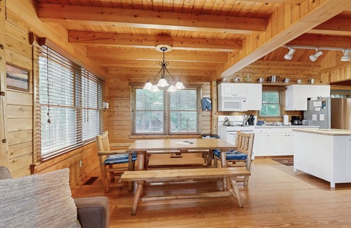 Experience what it's like to have your own private lake house! This two-level, cabin-style home is the perfect escape for anyone looking to get away from it all. Step out the back door and follow the staircase through the verdant meadow to arrive at your private dock on the shallow pond. Dangle your feet in the water while the sun glints off the surface, or paddle out in the provided canoe or kayak.