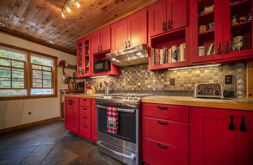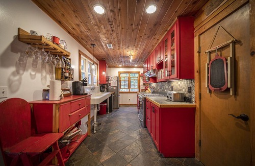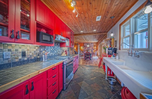 Stone fireplaces, 1 wood ( wood provided ) and 2 propane fireplaces, make this home warm and fun anytime of year. The kitchen with bear Paw Prints inside ( hep the bear got in during renovation) make the renovated kitchen charming and fun. Propane stovetop and oven for excellent cooking .