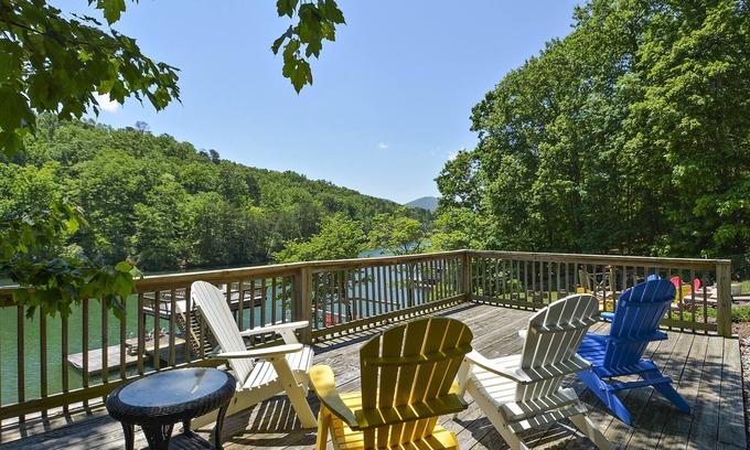 Lakefront Log Cabin with mountain and lake Views From nearly Every Room & over 280 feet of lakefront on Smith Mountain Lake. Wifi- unlimited, hot-tub, pool table, ping pong, fireplaces available in winter. Deep Water dock, allows use of boat slip and jump off the party deck to deep green water. Steps into the lake - both natural and man- made for those pups or people. 2 canoes, 2 kayaks on site for those paddling moments, and 2 paddle boards. Fenced in yard for the dogs and kids