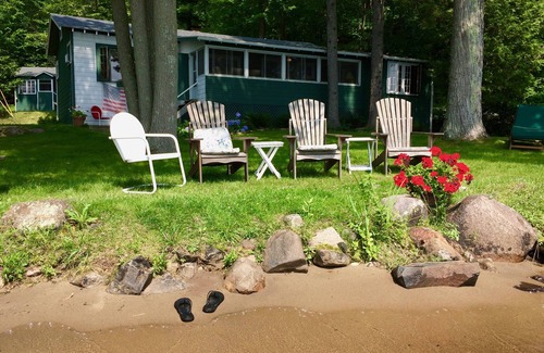 This private, lake front main house and separate guest cottage sits on one acre at the end of a private road. One of only a few properties with a private, walk-in sandy beach and western exposure, it's perfect for families who enjoy the afternoon sun. Dock has space for a 24' boat and is also a great place for early morning fishing. A hammock is strung between two trees and Adirondack chairs are on the lawn for kicking back. A Weber charcoal BBQ and a Weber gas grill are available for outdoor cooking, a picnic table near the water and a waterfront fireplace for late night campfires.