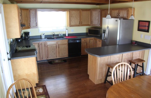 First floor: Kitchen, equipped with dishes and pots/pans for basic cooking, has a dishwasher, microwave, flat top stove, and new refrigerator. There are two types of coffee makers, the Keurig and a 12-cup coffee pot. The dining room and vaulted family room each have sliding glass doors overlooking the deck and lake. The family room includes a large 65” HD Smart TV. Upstairs is a bathroom with a shower and double sinks. The front master bedroom overlooks the lake with a Queen bed, double closets, a TV, and a sliding glass door that opens to the deck. The other bedroom upstairs has 1 full bed and 1 twin bed.