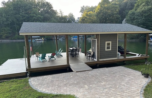 Beautiful house and a great location by land and water. This waterfront lake house is located in a quiet cove but still has views and easy access to the main channel. The stunning new dock provides an amazing amount of deck space with plenty of area for shade and sun. You can practically live on the dock. :)