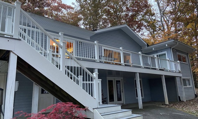 This house has been renovated inside, with new baths and hardwood floors upstairs. Three sliding glass doors open onto the composite deck. It also has 3 HD TVs and super-fast high-speed internet with a mesh wi-fi network. Linens and towels (bath and lake) are provided.