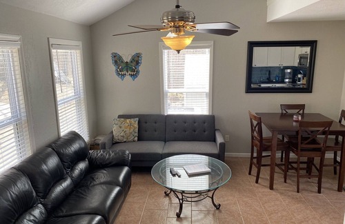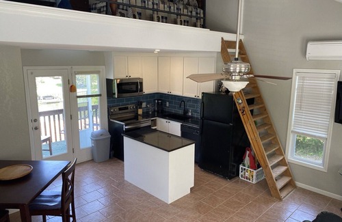 Walk up to the top deck to a small outdoor sitting area with a grill and view of the lake. Once inside, enjoy the open concept kitchen and living area, a ½ bath, and a lofted area with two full size beds. The kitchen is equipped with everything you need for cooking and dining. The dining room table has seating for four.