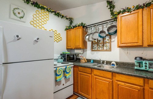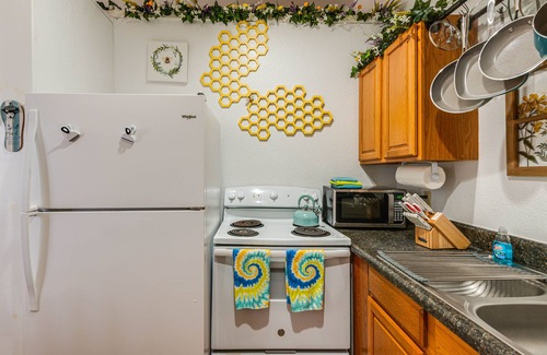 KITCHEN: Stove/oven, refrigerator, microwave, cooking basics, dishware & flatware, drip coffee maker, toaster oven, blender, Crockpot, barware, spices, trash bags & paper towels
