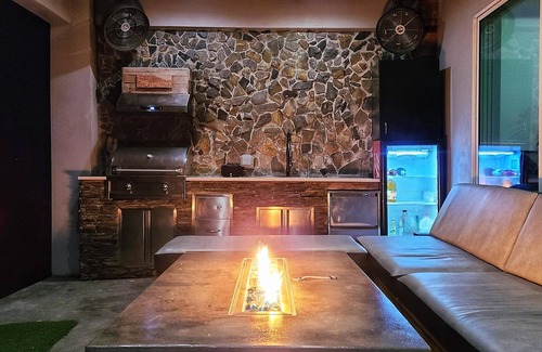 - The outdoor patio features an inviting atmosphere with an outdoor kitchen, grill, hammock swings, custom concrete fire table, and mist fans.