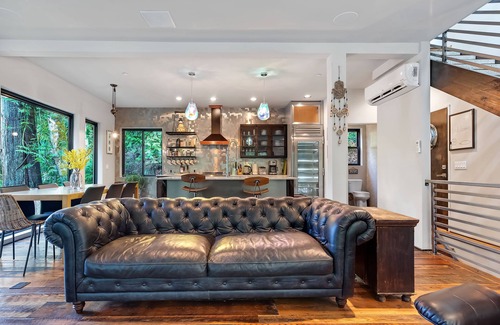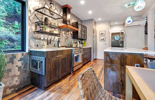 Maintain an ideal climate with six mini splits for heating and cooling, three fireplaces (excluding the living room fireplace), portable heating fans, and ceiling fans. Please exercise caution on the steep driveway with switchbacks, especially in adverse weather conditions.