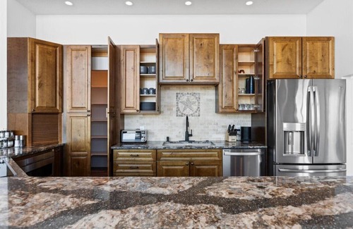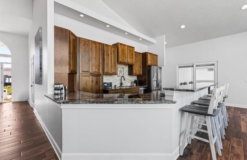Downstairs you will find a huge living room with L shaped sectional, pool table, arcade game table, full Sonos sound, full wet bar with its own 75" tv, mini fridge, theatre room with reclining theatre seating for 6 and 100" tv with Sonos sound and sub! (alcohol not included with any rental)