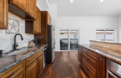 Outside on the back deck you will find an outdoor dining table for 6 with sun shade, lounge chairs, ample outdoor seating including a huge outdoor L shaped couch! Under the deck and in the back yard you will find a 5 person hot tub, outdoor kitchen including propane grill, another 6 person dining table, gas fire pit, deck chairs, bar chairs, bag toss game, washer toss game, and ladder ball game!