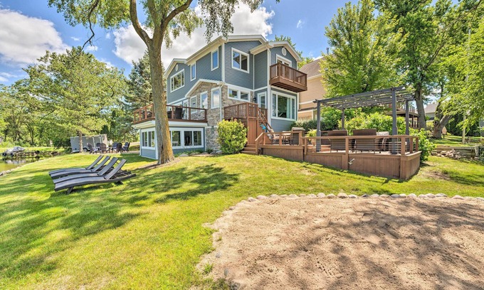 Revel in lakefront luxury and wholesome fun at this 5-bedroom, 2.5-bath Bristol home. Boasting direct lake access and sought-after amenities, this vacation rental delivers utter relaxation for the whole family or group. Fuel up with some lunch on the grill, followed by a day at the beach or in the water. Opt for nearby thrills like Six Flags, Milwaukee or Chicago, and Wilmot Mountain in the winter months. Top off the night with a bonfire, or retreat indoors where Smart TVs and board games await!
