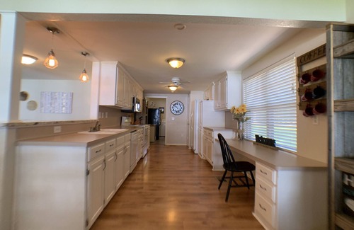 The house has one living room with a ROKU enabled TV and fully stocked kitchen. 3 of the bedrooms downstairs have queen beds, 1 downstairs bedroom has 2 twin daybeds with trundles).1 downstairs bedroom has a twin daybed with trundle. The bunkroom upstairs is the perfect place for kids or teens. It has 4 built-in twin bunkbeds and a standalone twin bed to sleep a total of 5 upstairs. If you need more space for your group, we have a 2 bed, 1 bath overflow cabin with kitchen and laundry that can be reserved for $160/night*See host for details on reserving more space. All linens and towels are provided. In addition to comfortable furnishings and 10-top dining table our house offers multiple outside eating areas, gas and charcoal grills, fire pit with chairs, covered back porch, a shaded back yard with tall trees and plenty of room to kick or throw a ball around! There is Wi-fi and a washer/dryer for your use during your stay.