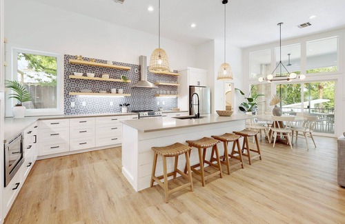 Experience the ultimate lake-side getaway at this expansive single story farmhouse with seven bedrooms on the open water of Lake LBJ.