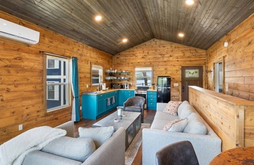 Spacious living area and dining nook, full bath (with tub), and full kitchen upstairs and sleeping area and full bath (with shower) downstairs. Sleeps eight in four queen bunk beds.