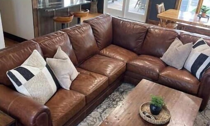 The living room features a spacious and comfortable leather sectional, an end table, a coffee table, a large smart TV, a ceiling fan, and a new Buck wood-burning stove to keep you warm on those chilly days and nights.