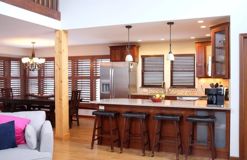 The open concept living room is spacious with ample seating for 10 -12 in front of the gas log fireplace and 55 inch flat screen HD SmartTV. Enjoy the surround sound system in this room as you watch your favorite programs, movies and sporting events. In the summer months, open the double sliding glass doors and relax in the three season, screened-in porch! In winter months, the warmth of the home creates an indoor ambiance perfect for reading books, sipping tea, and cozying up with a warm blanket.