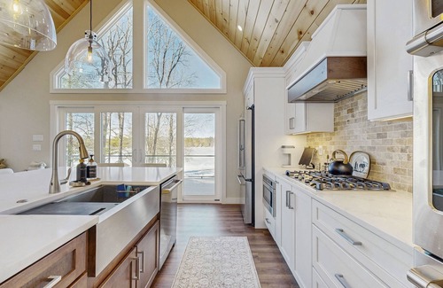 Delight in breathtaking lake views from most rooms and enjoy the convenience of a double-oven in the kitchen for preparing family feasts. Spend your days on the private beach, exploring the lake with 4 kayaks and a paddleboard. Unwind in the evenings with cocktails on the expansive deck or private large dock on your private island as the sun sets. End your nights around the campfire or soaking in the hot tub, serenaded by the soothing calls of the loons.