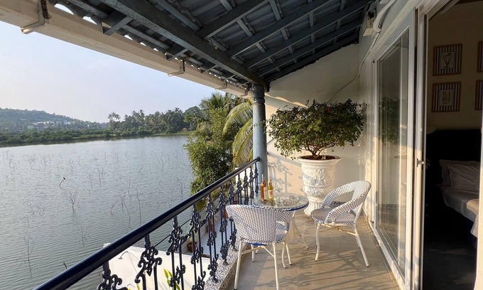 The BluJam Villa, Arpora is a beautiful lakefront 3BHK villa in North Goa with an infinity-edge private pool, offering stunning views of the lake, forest, & sunsets