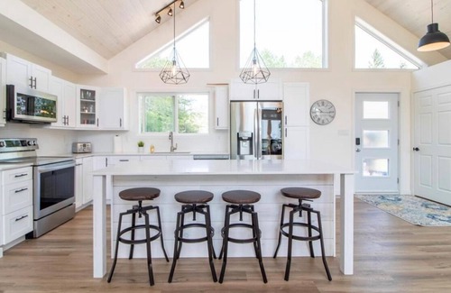 Sleeps 6 people with 2 queen beds and a King bed in master. Has 2 bathrooms, washer and dryer, BBQ, Air Fryer, oven, toaster, Coffee Maker, and fire pit. Private lot with park nearby to bike or walk.