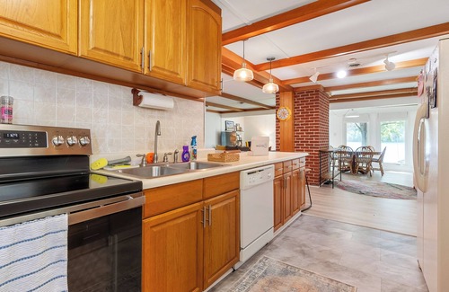 Unwind at this serene lakefront getaway featuring a private dock, shaded outdoor seating, fire pit, and stunning water views. Inside, enjoy an open-concept layout with cozy lounge areas, a fully equipped kitchen, and bright bedrooms with plush bedding. The home offers modern bathrooms, in-unit laundry, and a breakfast bar perfect for morning coffee. Whether you're here to fish, kayak, dine lakeside, or simply relax by the water, this spacious retreat has everything for a peaceful stay.