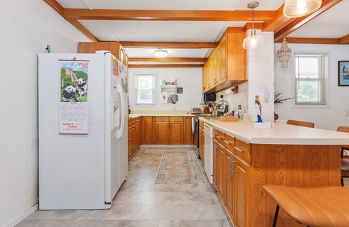 This peaceful home on a quiet street sits right on Claytor Lake. It features two bedrooms and one bathroom. Bedroom 1 has a bed that converts from a full to a king and includes extra pillows, blankets, and beach towels in the closet. Bedroom 2 has a queen bed. The bathroom has a walk-in shower.