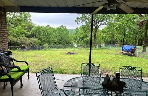 Your whole group will be comfortable in this spacious an unique space. Lakefront views from the living room and patio. Lots of games, books and puzzles to play on the poker/game table. There is also a pool table! Outdoor enjoy a nice large patio with cornhole and a firepit with unlimited firewood. Take a short walk to a private covered dock with 2 kayaks and lots of fishing supplies. You can bring your boat or jet skis and keep them there for your entire stay...no putting the boat up everyday. Just minutes away from Eufaula to eat or shop. Arrowhead park is also just minutes away. A nice quiet peaceful place for the family!