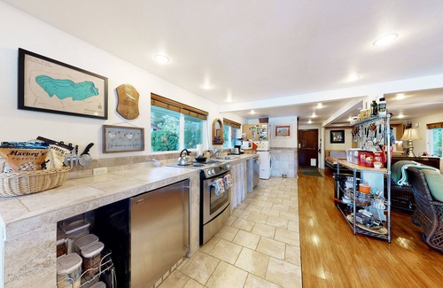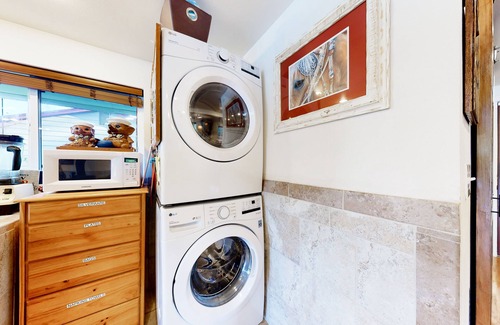 Upon entering this quaint home away from home, you will encounter a spacious open floor plan seamlessly combining the sleeping area, kitchenette, living room, and dining area. Unwind with your loved ones in the inviting living area, featuring comfortable furniture throughout, a wood stove, a large smart TV with streaming services, and plenty of DVDs to choose from. When you are done watching TV, hop over to the well-appointed kitchenette and treat your guests to delicious homemade snacks or full course meals. Other appliances include a full-size stove, oven, dishwasher, and microwave. In addition, you can find a stackable full size washer/dryer for your laundry needs. Additional amenities include a partial AC unit and free high-speed WiFi.