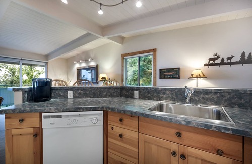 The full kitchen is equipped with a full-size fridge, a dishwasher and a stove, perfect for preparing simple meals or heating up leftovers. The rustic charm is evident in the cabinetry and countertops, which feature natural wood finishes that complement the overall Montana aesthetic. Basic cooking utensils, dishes, and glassware are provided, allowing you to enjoy home-cooked meals with ease.