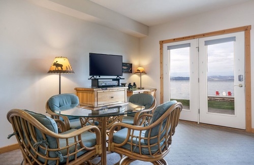 This rustic waterfront studio apartment at Many Springs Resort is a cozy retreat nestled just outside the picturesque town of Bigfork, Montana, offering breathtaking views of Yellow Bay on Flathead Lake. This charming space is designed to provide comfort and convenience in a compact yet inviting setting. Step outside onto your private waterfront balcony to experience the true beauty of this location. A cozy patio table and chairs offers the perfect spot to sip your morning coffee or enjoy an alfresco meal while gazing at the white capped waters of Flathead Lake. The tranquil sound of lapping waves and the scent of pine trees in the air create an idyllic setting for relaxation.