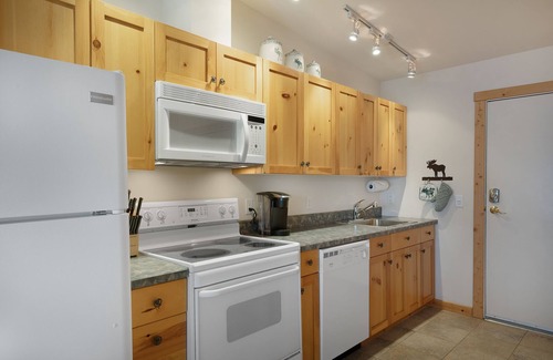 The full kitchen is equipped with a full-size fridge, a dishwasher and a stove, perfect for preparing simple meals or heating up leftovers. The rustic charm is evident in the cabinetry and countertops, which feature natural wood finishes that complement the overall Montana aesthetic. Basic cooking utensils, dishes, and glassware are provided, allowing you to enjoy home-cooked meals with ease.
