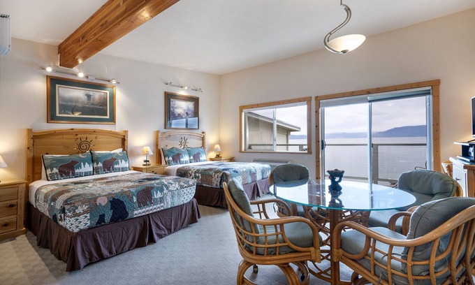 This rustic waterfront studio apartment at Many Springs Resort is a cozy retreat nestled just outside the picturesque town of Bigfork, Montana, offering breathtaking views of Yellow Bay on Flathead Lake. This charming space is designed to provide comfort and convenience in a compact yet inviting setting. Step outside onto your private waterfront balcony to experience the true beauty of this location. A cozy patio table and chairs offers the perfect spot to sip your morning coffee or enjoy an alfresco meal while gazing at the white capped waters of Flathead Lake. The tranquil sound of lapping waves and the scent of pine trees in the air create an idyllic setting for relaxation.