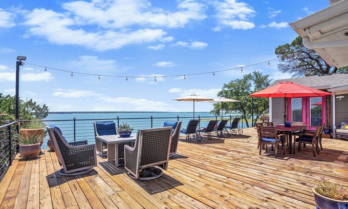 Sunset views & lake access a rare find. This is the perfect place to escape & enjoy the natural beauty of lake Whitney. Spacious deck overlooking the lake, fire pit, grill & lots of outdoor seating for all 10 guest. Relax after a day on the lake in the open-concept living room w/huge windows & comfortable seating. Fully equipped kitchen features large island perfect for preparing meals while enjoying the views. Five bedrooms w/comfortable furnishings & linens. Master bedroom w/king bed & large picture window overlooking the lake. Bring your boat, canoe, water toys and sunscreen. You'll feel like you have the lake to yourself in our Semiprivate cove. Enjoy water, hiking, cliff diving or take a trip down the Brazos river.