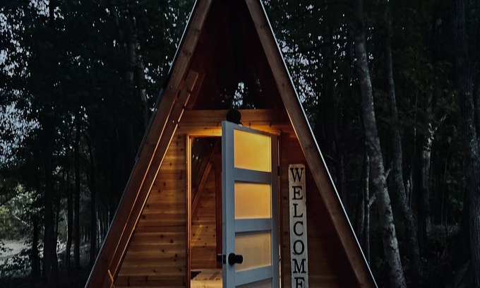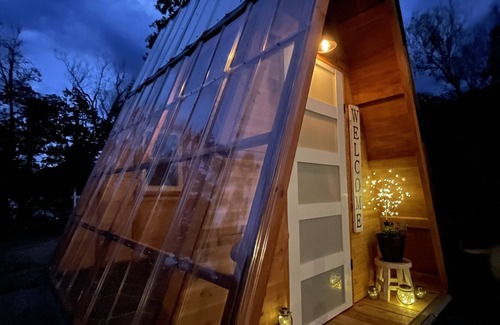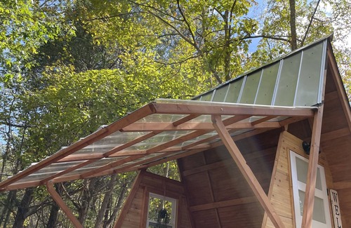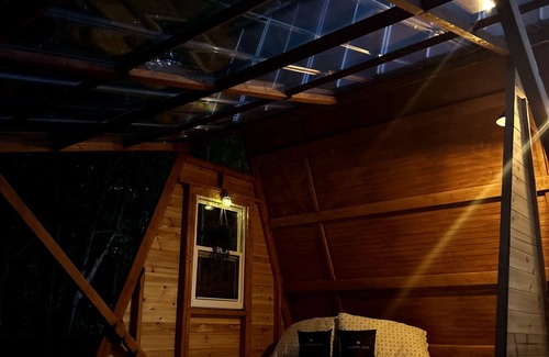 A truly unique glamping experience! This micro cottage is steps from the water and features 11 foot ceilings and a roof that opens to create a indoor/outdoor space.
