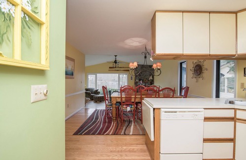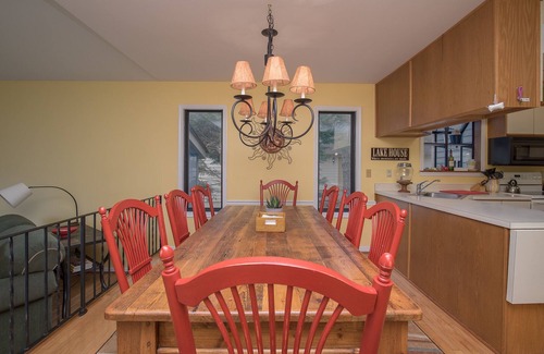 Large, high ceilinged, open living/dining/kitchen space has panoramic view of lake, and is great for sharing with family and friends. Wood burning fireplace for those cool fall or winter getaways. Living room opens onto large screened-in porch.