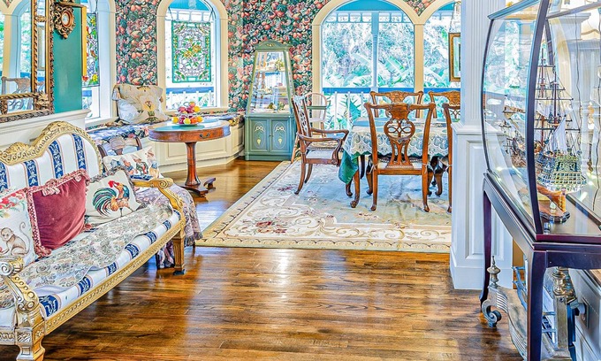 Your stay at the Lakefront Victorian House for Time Travelers & Event is complemented by a range of exquisite amenities. As you enter, be captivated by the grand twin staircase, ornate chandeliers, and charming stained-glass windows. Each themed room is adorned with antique furnishings, adding to the property's romantic atmosphere. Enjoy leisurely moments in the dedicated game room, savor delightful meals at the large dining tables, or host barbecues in the expansive yard with a gas grill available for rent. For those seeking outdoor adventures, the private dock provides access to kayaks and canoes, perfect for exploring the tranquil waters or casting a line for fishing.