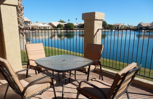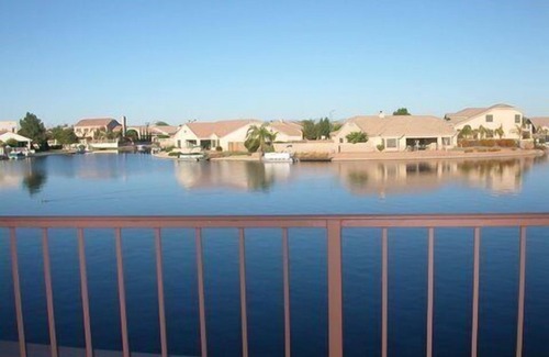 Experience awesome waterfront views from almost every room in this lakefront, two story townhouse villa. This home is located in a private and quiet gated community . Both the spacious master suite (queen bed) and the great room area have patio doors to a large, covered waterfront patio. A community pool, hot tub and fishing also await you. The second story contains another bedroom (double bed) and additional full bath. The den is a perfect TV or reading room with double doors to the balcony where you can view the sunrise, rising full moon, Christmas boat parade and 4th of July fireworks. Relax and enjoy the double recliner with console and cup holder. A large, fully equipped kitchen, washer, dryer, garage, desk with Wi-Fi, lake view dining area, large master suite, walk-in closet are some of the other amenities you will appreciate. Close to Peoria Sports Complex, Cardinals Phoenix stadium, Coyotes arena and Rio Vista Park