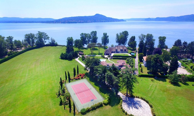 This idyllic lakefront estate is a private paradise set within a large park (80,000 m²) which extends right up to the shores of Lake Maggiore, where privacy, tranquillity and relaxation are guaranteed. The grounds offer direct lake access, heated swimming pool, tennis court and a 9-hole golf course. Bikes, canoes, motorboat and a sailing dinghy are also available for use. In addition to all this, it’s possible to go waterskiing or book a sight-seeing trip with the owner in his private helicopter, sailing yacht (15m) or vintage wooden motorboat (12m). A private chef and massage service are also available upon request. See the rental conditions for all available services.