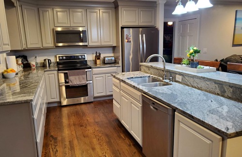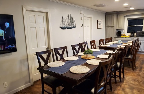 The house includes two complete kitchens, a pool table and foosball table. This 5-bedroom, 3-bath retreat is designed for your ultimate relaxation. Enjoy friendly competition with a pool table, foosball table, and card table. The heart of the home boasts an updated kitchen, perfect for preparing delicious meals, and a luxurious master suite for peaceful nights. For your convenience, sheets and towels are included in your rental. Downstairs has an additional kitchen, living room and 2 bedrooms with a bathroom.