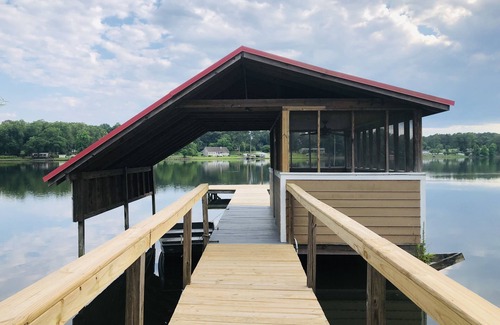 Relax in this farmhouse-style lakehouse with a 1-acre fenced backyard, perfect for sitting around the fire pit and enjoying the fresh, country air. Directly across the the front yard is the pathway to the private dock and screened dock house. Guests can enjoy fishing or sunbathing from the dock (HOA restricts boat or kayak use by guests.) The screened dockhouse is waiting for you to enjoy an afternoon picnic.