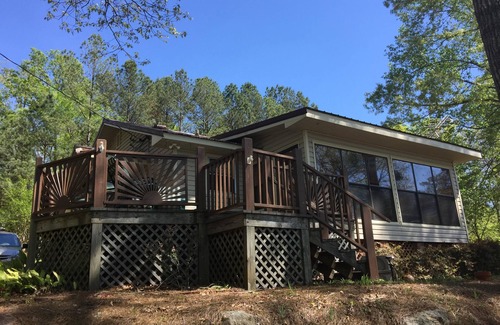 PLEASE NOTE: WE ARE NOT CURRENTLY ACCEPTING VRBO RESERVATIONS PENDING COUNTY APPROVAL under their new short-term rental policy. For updates on availability or information about possible longer term rental, please contact four-zero-four, three-seven-five, one-one-six-five (404-375-1165). Comfortable and cozy lakehouse on large lot less than one hour drive from Atlanta. 2 bedroom, 1 bath, full kitchen including dishwasher, microwave. Also, gas grill, fireplace, and washer/dryer. Sleeps 8 (2 kings, 2 sets of bunk beds). There's Wifi and a flat screen (Roku) TV. Picnic table on the patio, and a table and chair set on the deck. Swim at the sandy bottom beach and off of the deep water dock. Kayaks available for use by renters. Groceries and restaurant nearby.