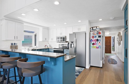 - Kitchen: features mother of pearl shell backsplash, granite, under-cabinet lighting, & a large clear display beverage fridge in addition to a double-door refrigerator. Also, has an oven with an electric cooktop, microwave, Keurig, Ninja blender, toaster, &more.
