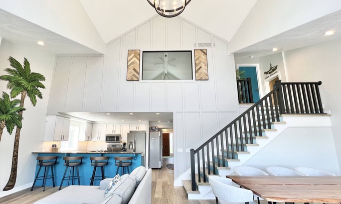 The great room has soaring 22 ft ceilings with access to a large deck, beach, & lake. It features an electric fireplace, a sectional with a full-size sleeper sofa, & a pair of 12ft tall wooden palm trees which were custom-made for this home. The bedrooms feature an Alexa device (to play ambient noises at night to help you sleep & set alarms) & a smart TV so you can log in to watch your favorite shows. For the ultimate sleep, each bedroom also has a Sealy or Serta mattress, bamboo sheets, a fan, & blackout window shades.