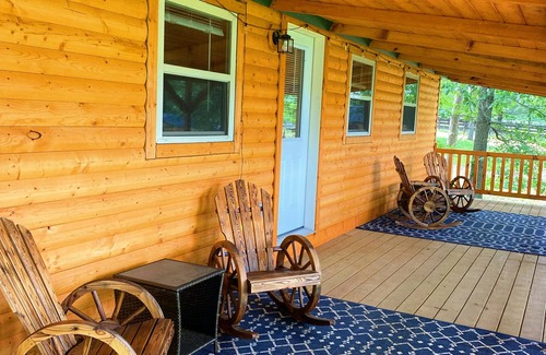 The cabin has a great porch overlooking ponds, in-cabin laundry, TV, Full kitchens, vaulted ceilings, ceiling fans, ac/heat and onsite parking.
