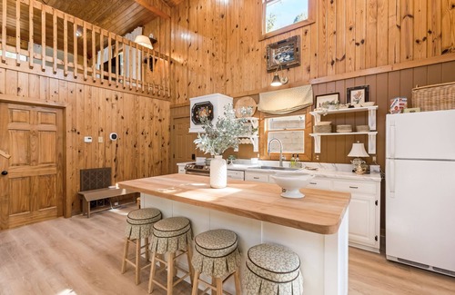 - Main Floor: This beautiful open floor plan includes a main floor with two full bedrooms with queen beds, a full bathroom and a large open kitchen and dining area. The kitchen has all the cookware and dishware needed for creating those wonderful family meals. There is a wood burning fireplace and both a dining table and an island with additional seating