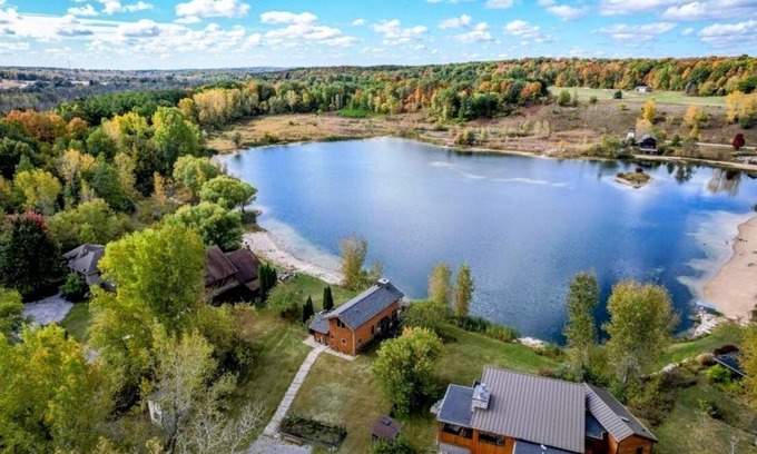 Longhouse-Style Architecture: Unique design with expansive windows showcasing lake views.